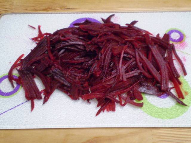 5. Свеклу нарезаем тонкими брусочками или соломкой.