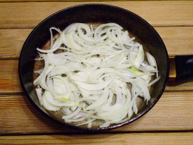 3. Нарезаем полукольцами лук репчатый. Обжариваем до готовности лук на масле растительном. На среднем огне жарим, помешивая, минут 7-9.