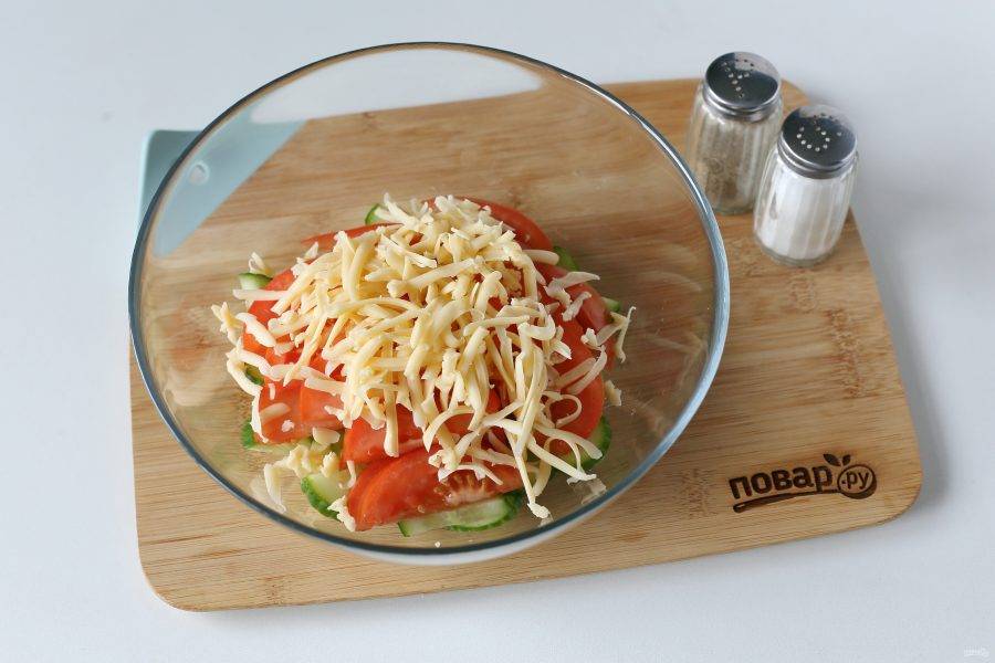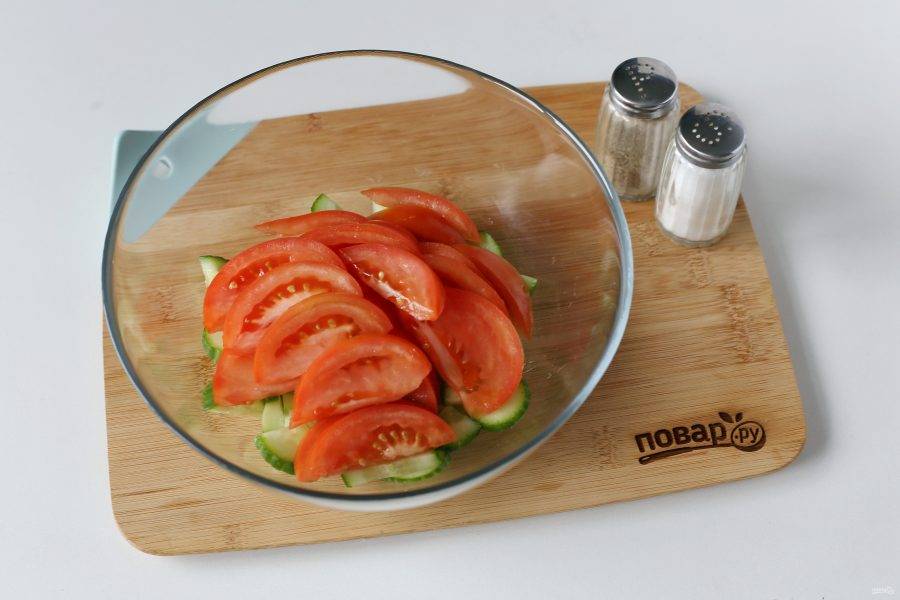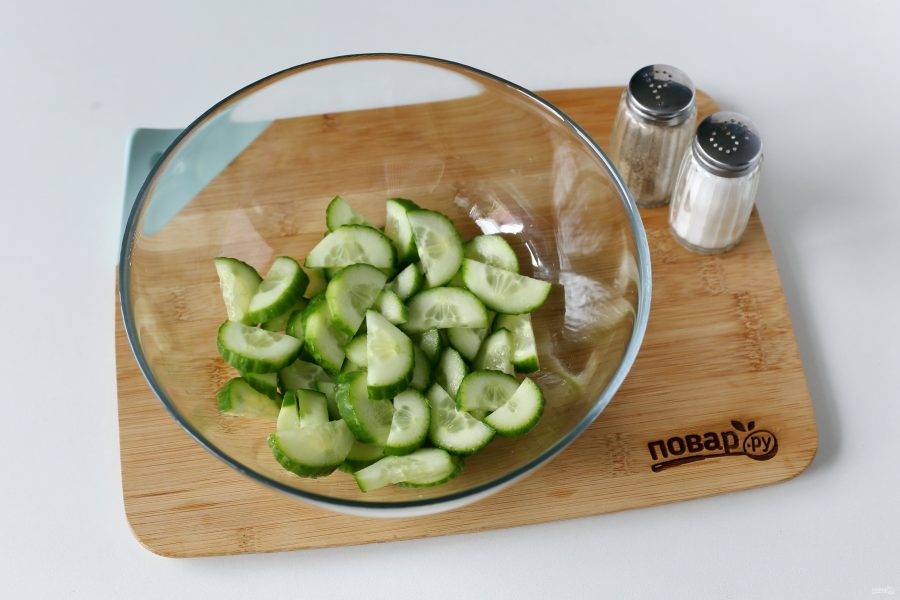 Огурец нарежьте полукружьями и переложите в салатник или в любую глубокую миску.