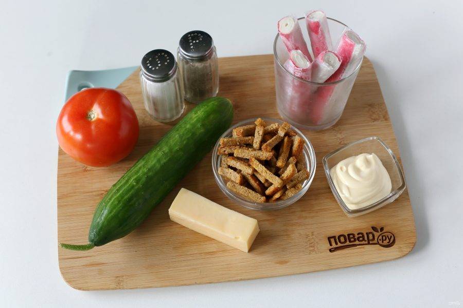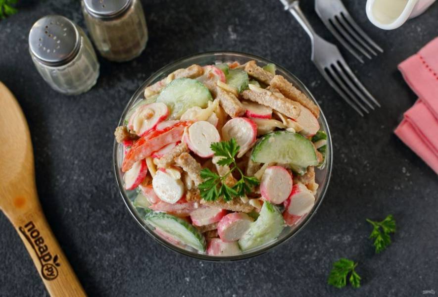 Добавьте пачку любимых сухариков. Заправляйте салат непосредственно перед подачей на стол, чтобы сухарики оставались хрустящие.