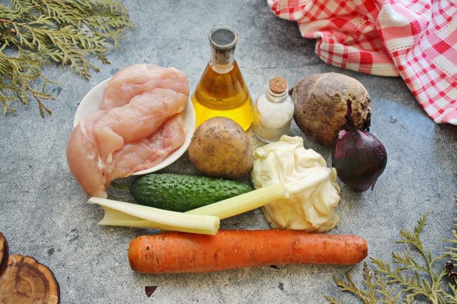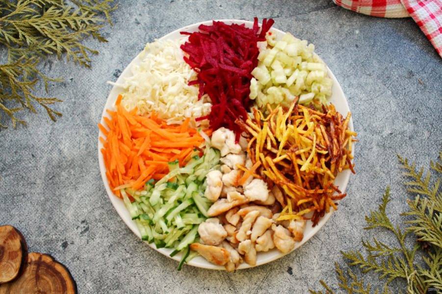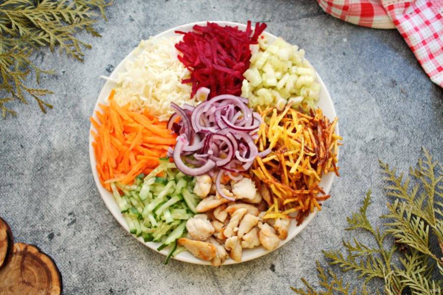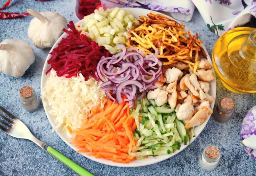 Очищенную свеклу натрите на крупной терке, сельдерей порежьте тонко поперек черешка. Свеклу, сельдерей, картофель, обжаренную курицу так же разложите на сервировочное блюдо.