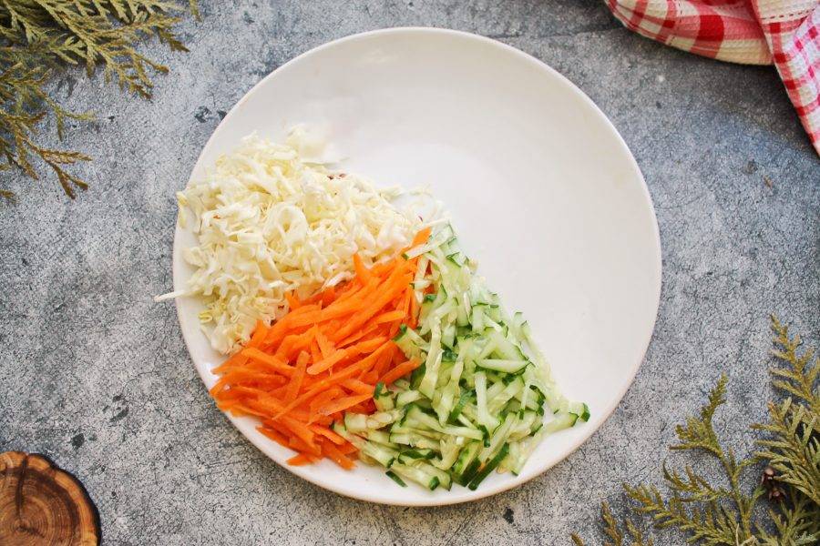 Морковь почистите, сполосните и натрите на крупной терке или для моркови по-корейски. Огурец и капусту порежьте соломкой. Разложите огурец, морковь и капусту на сервировочное блюдо.