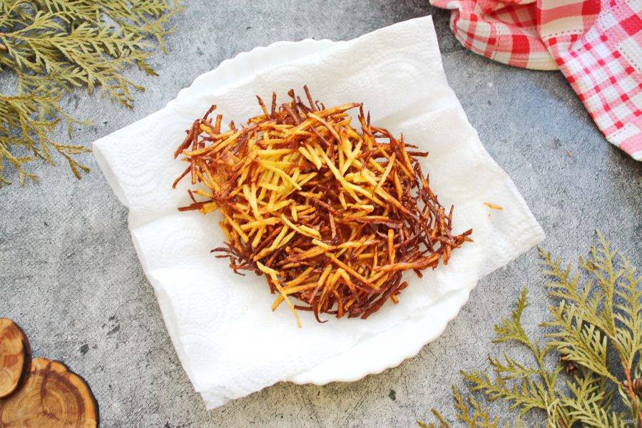 Картофель почистите, сполосните и натрите на терке для моркови по-корейски. Растительное масло разогрейте и обжарьте картофель небольшими частями до золотистой соломки. Готовый картофель пай переложите на бумажное полотенце, чтобы убрать лишнее масло.