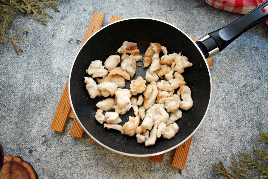 Куриное филе порежьте короткой соломкой, посолите, поперчите и обжарьте в горячем растительном масле до готовности. Переложите курицу в тарелку и остудите.