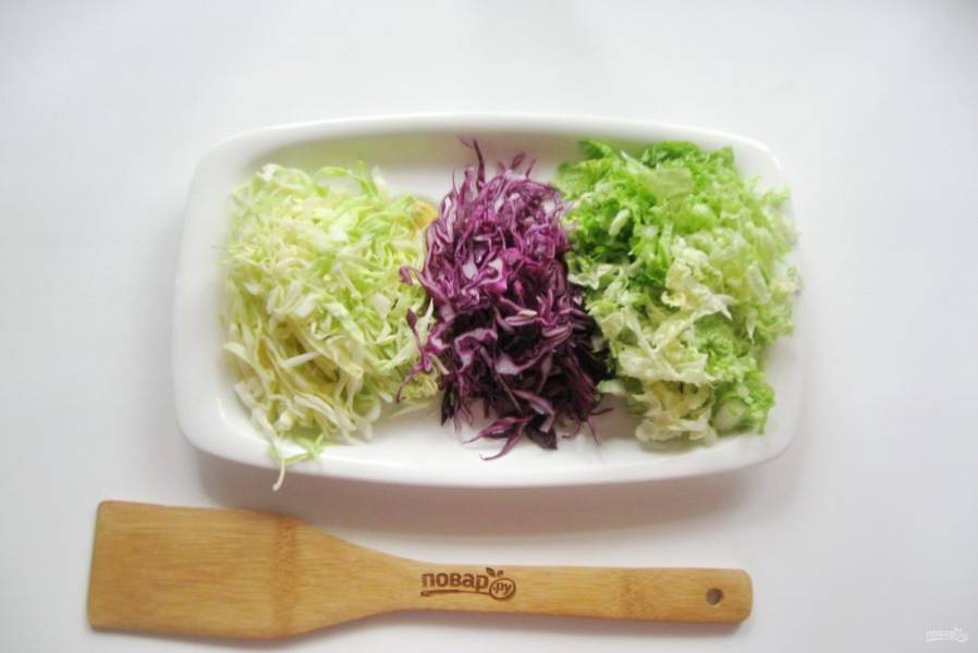 Все три вида капусты нарежьте тонкой соломкой.