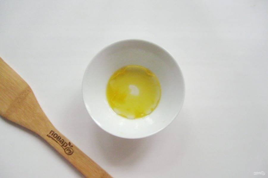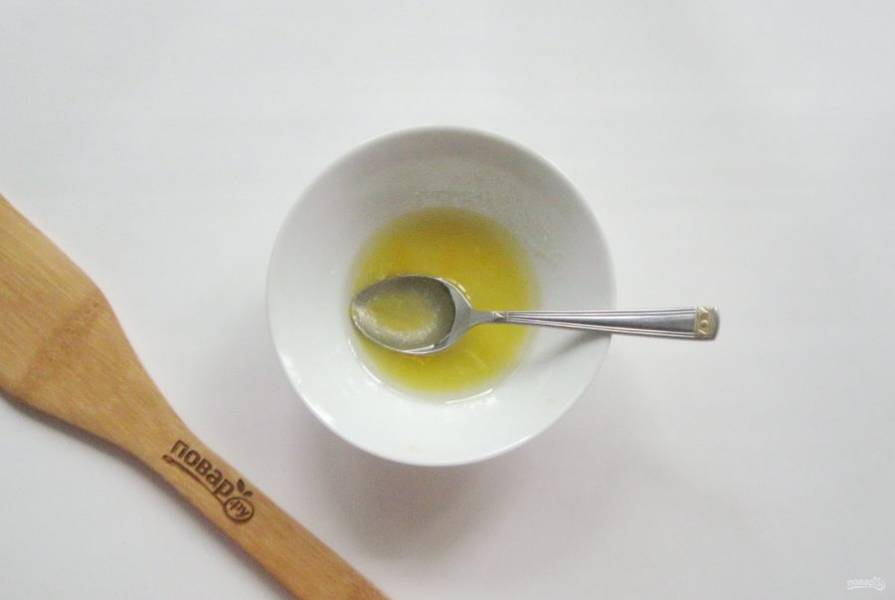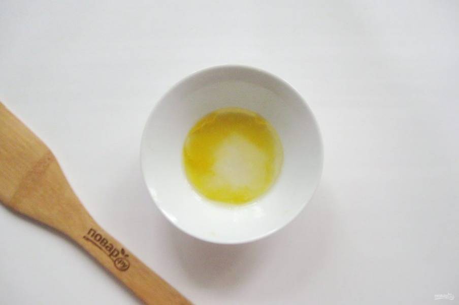 Приготовьте заправку. В мисочку с апельсиновым соком налейте уксус и растительное масло.