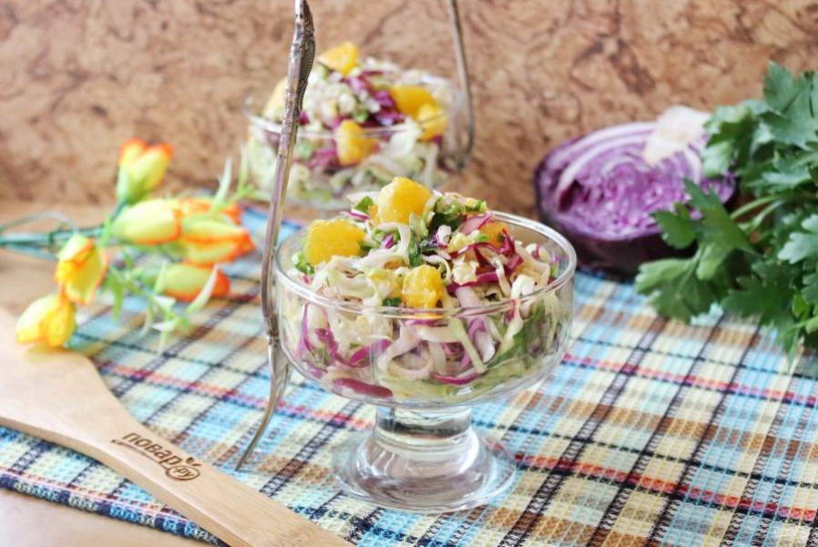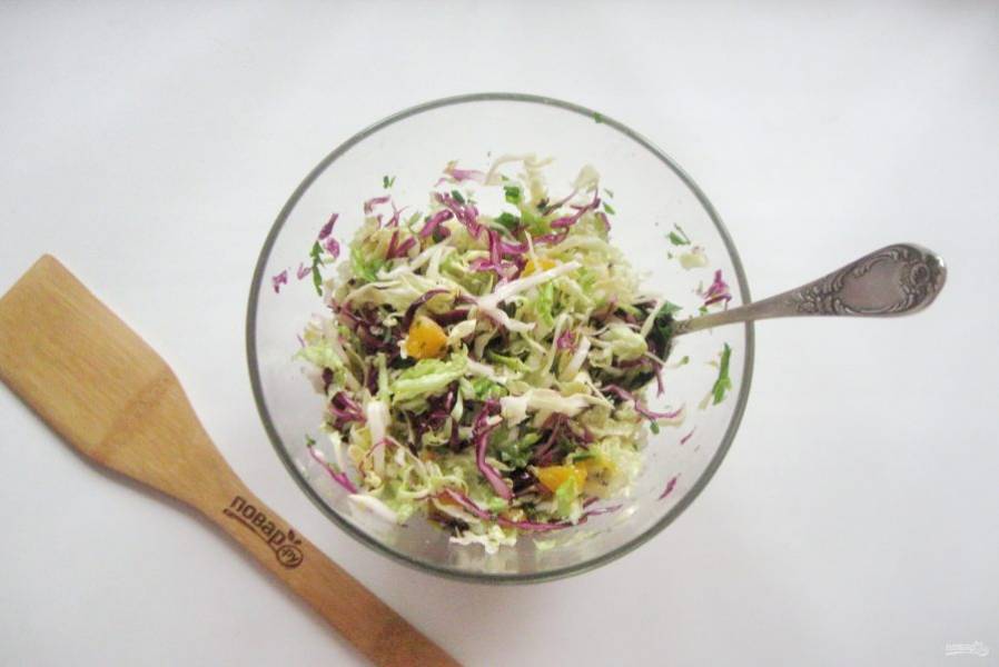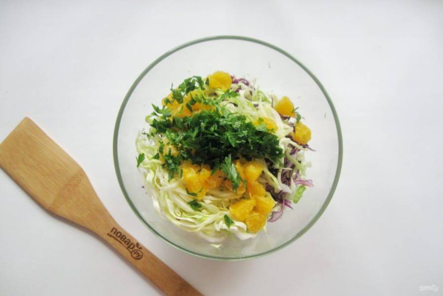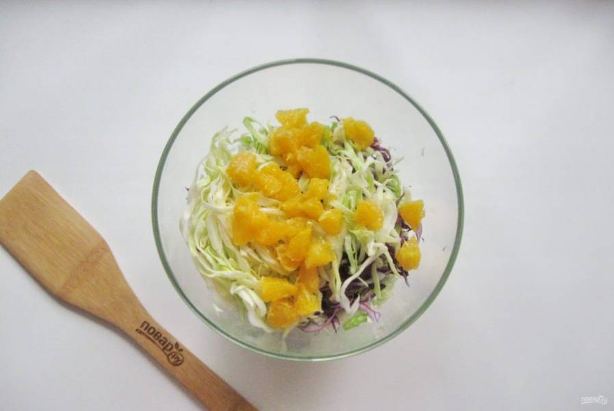 Апельсиновые дольки нарежьте и добавьте в салат.