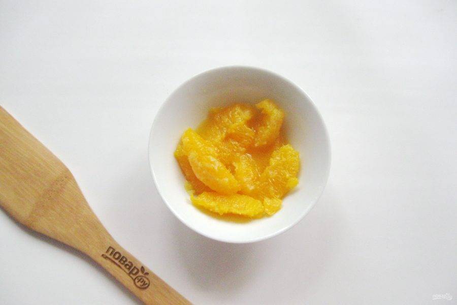 Апельсин помойте, очистите, разберите на дольки и снимите полностью белую пленку. Должна остаться одна мякоть. При этом весь сок, который выделится, соберите в отдельную емкость.