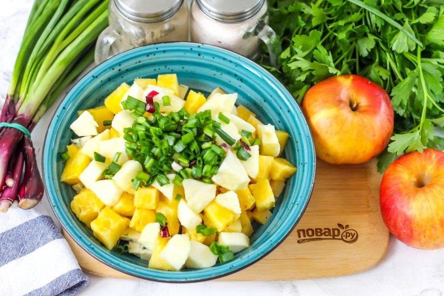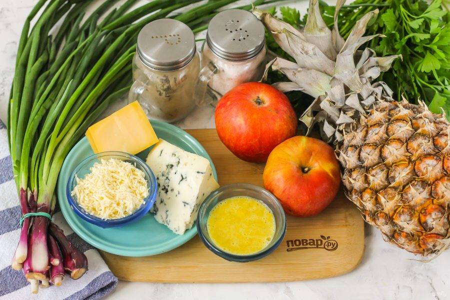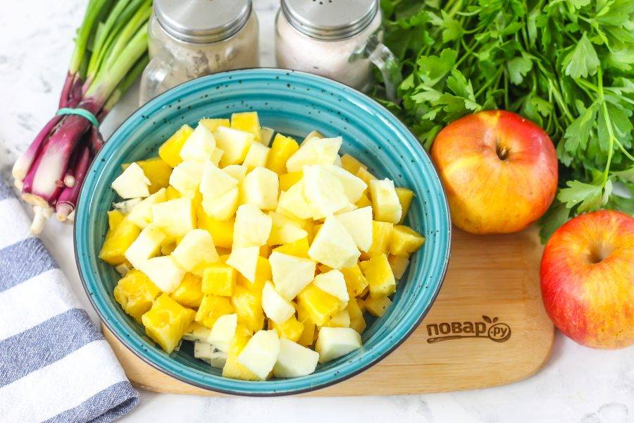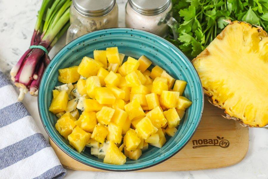 Ананас очистите от кожуры, удалите твердую сердцевину. Нарежьте такими же кубиками, как и сыр, высыпьте нарезку в емкость.