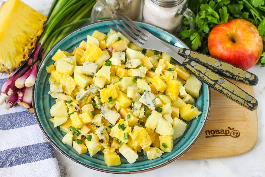 Настоящий кулинарный шедевр — сочный салат "Три сыра", который идеально подойдет для романтических тет-а-тетов на ужин или на завтрак. В нем сочетается нежный сливочный вкус и яркая фруктовая нотка.