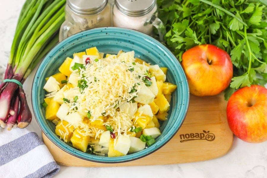 Очистите яблоки от кожуры, промойте в воде. Разрежьте на четвертинки и срежьте семена. Нарежьте кубиками и добавьте к остальным ингредиентам.