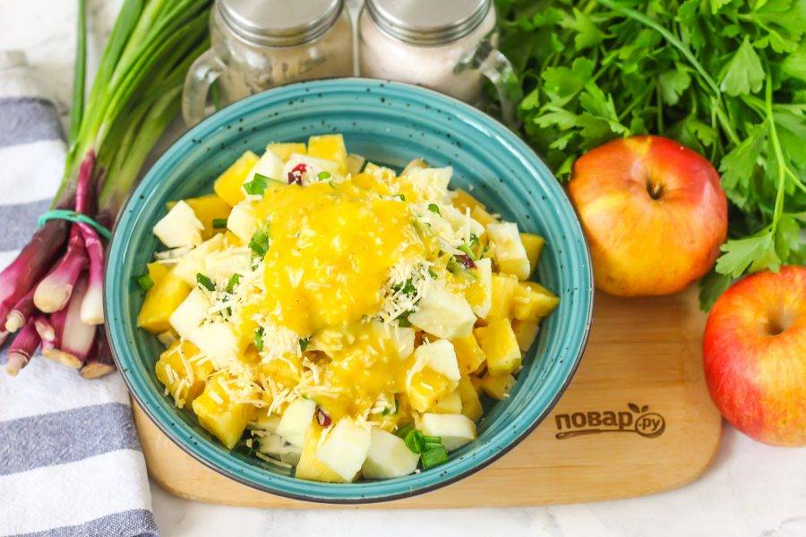 Добавьте майонез любой жирности и посолите блюдо, аккуратно все перемешайте.