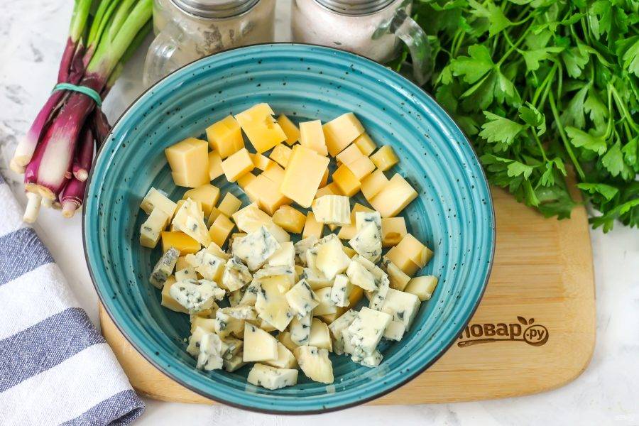 Нарежьте твердый сыр и сыр "Дор Блю" порционными кубиками, высыпьте нарезки в глубокую емкость.