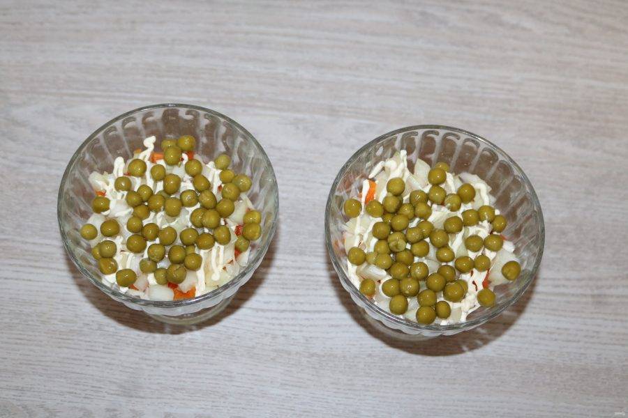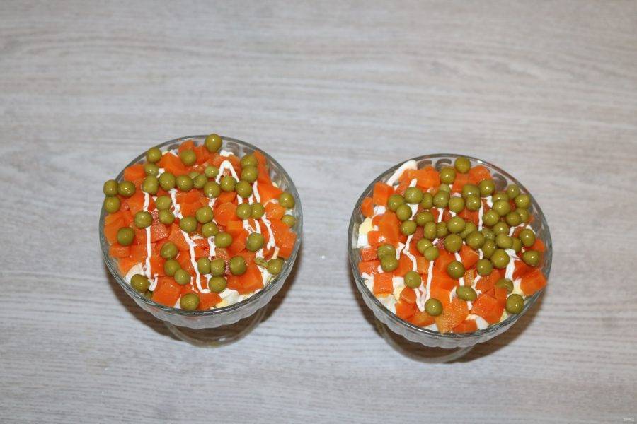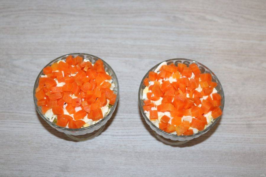 Салат выкладывайте слоями, на одно большое блюдо, либо порционно в салатники. Каждый слой слегка смазывайте майонезом. 1 слой - половина всей моркови.