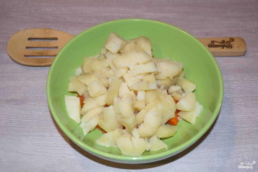 Отварную морковь нужно нарезать небольшими кубиками. Блюдо будем готовить в едином салатнике. Нарезанную отваренную морковь складываем в мисочку.