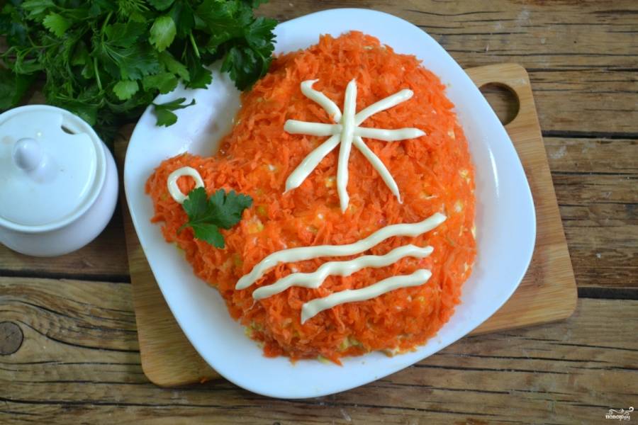8. Украсьте готовую варежку майонезом и зеленью. Салат можно подавать, приятного аппетита!