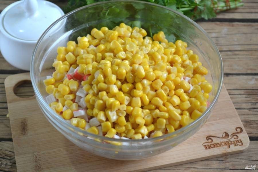 4. Добавьте консервированную кукурузу, предварительно сцедив с неё сок.