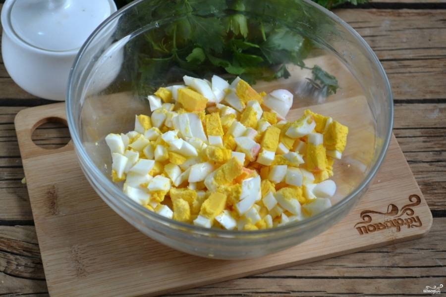 2. Яйца очистите от скорлупы и нарежьте небольшими кубиками.