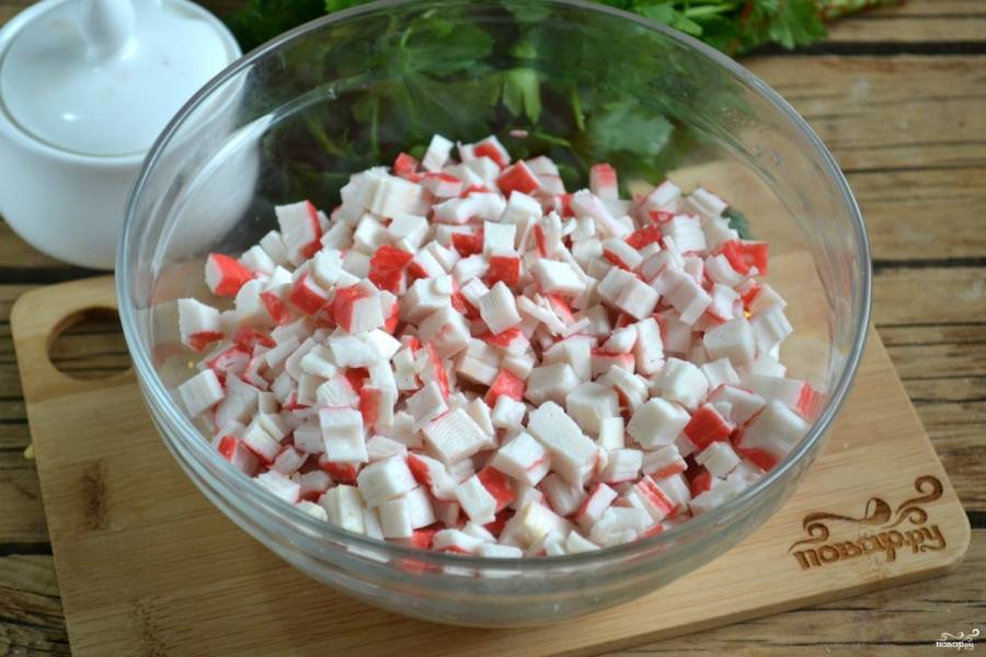 3. Крабовые палочки также порежьте кубиками небольшого размера.