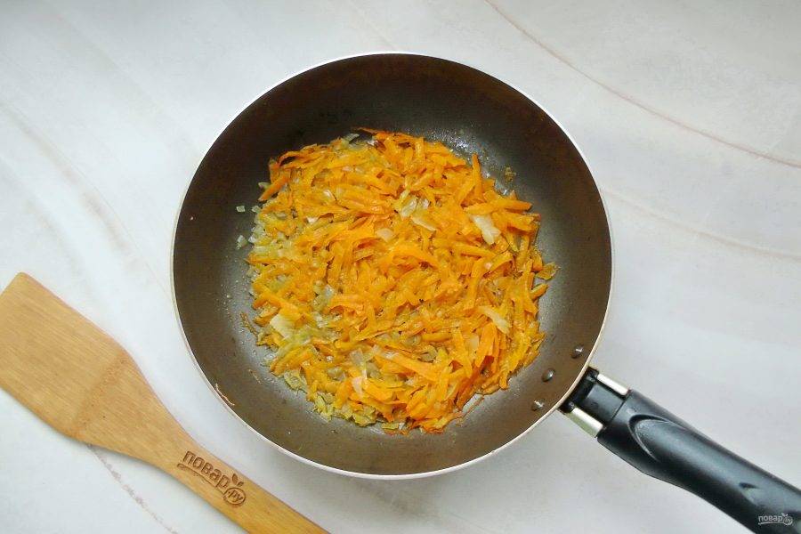 Лук и морковь очистите и помойте. Лук мелко нарежьте, а морковь натрите на терке. Выложите в сковороду с подсолнечным маслом и поджарьте до мягкости. Посолите по вкусу.
