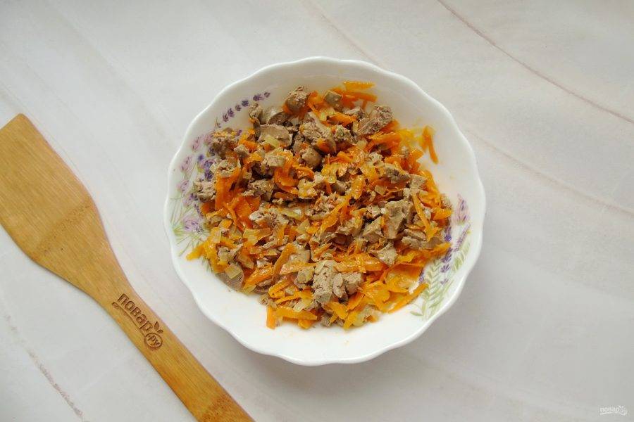 Отваренную куриную печенку мелко нарежьте и перемешайте с луком и морковью.