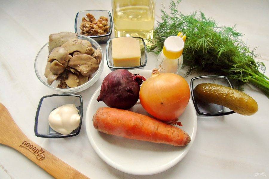 Выложите салат слоями в такой последовательности: свекла, орехи, куриная печень с морковью и луком, маринованный огурец, сыр. Каждый слой, кроме верхнего, смажьте майонезом.