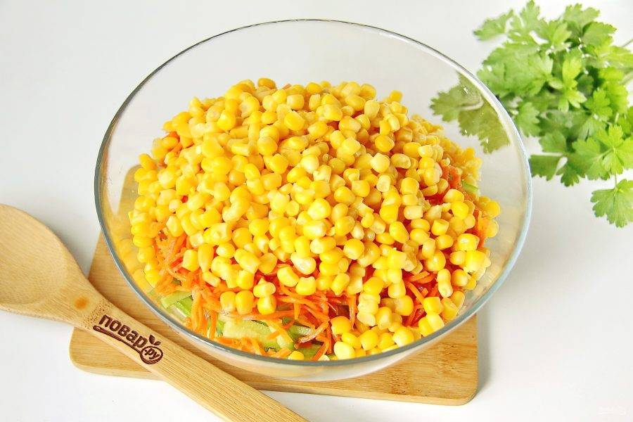 Добавьте кукурузу из банки, предварительно слив всю жидкость.