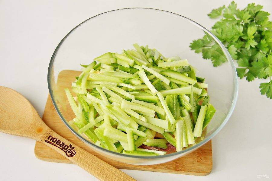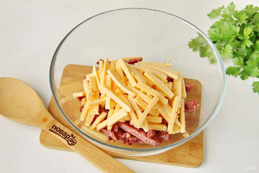 Нарежьте соломкой колбасу и переложите ее сразу в салатник или глубокую миску.