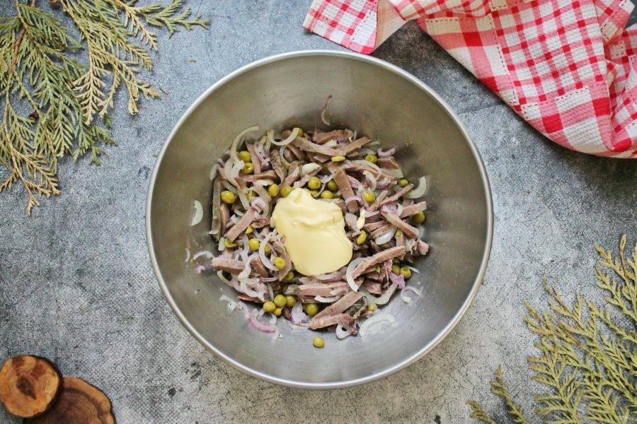 Салат посолите, поперчите и перемешайте. Заправьте салат "Венский" с языком майонезом, перемешайте и переложите в салатник, сразу подавайте.