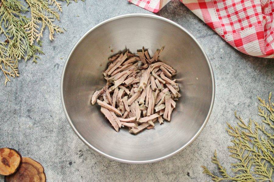 Отварной язык порежьте средней соломкой и выложите в миску.