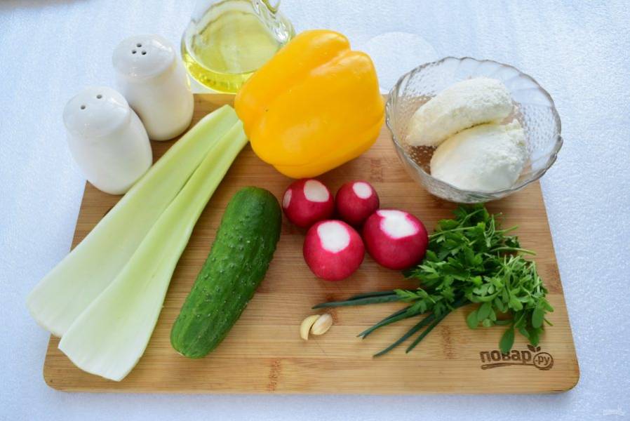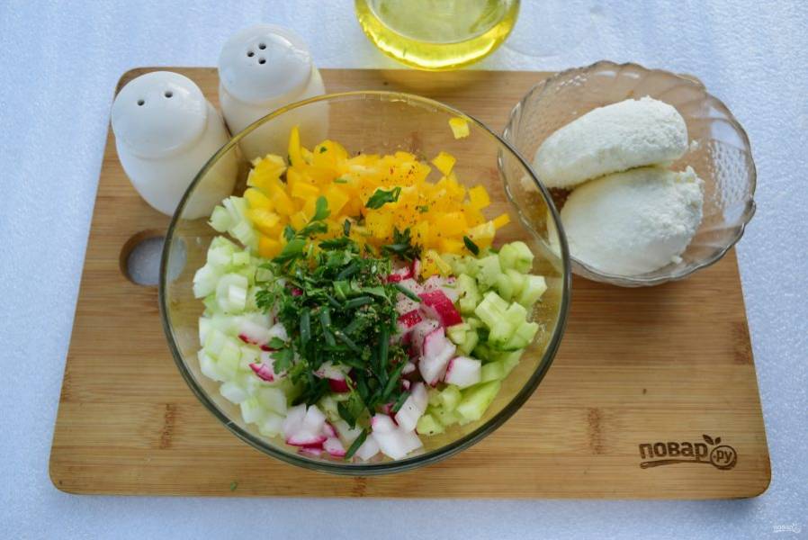 Овощи нарежьте кубиками, чеснок и зелень измельчите. Добавьте перец и соль по вкусу, перемешайте.
