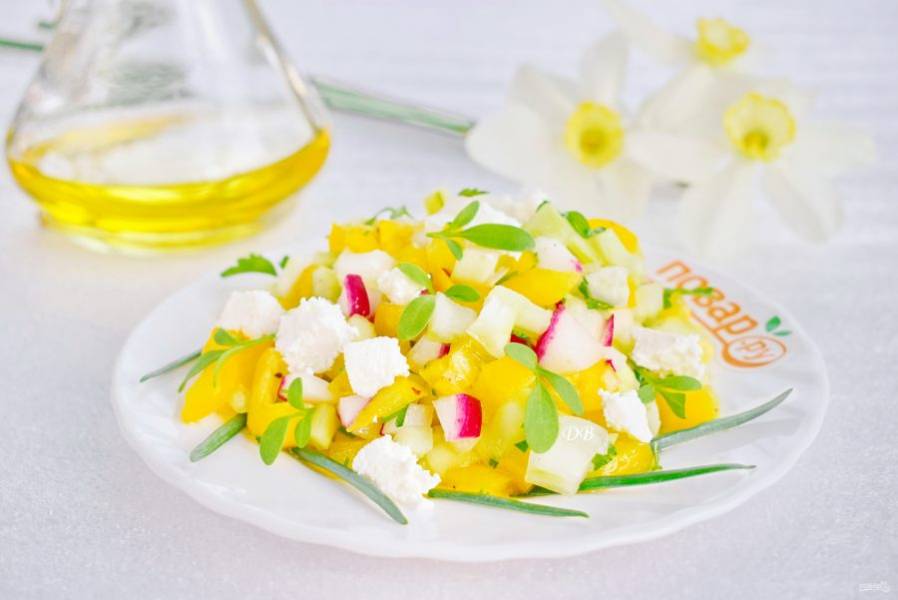Творог нарежьте мелкими кубиками. Заправьте оливковым маслом. Приятного аппетита!
