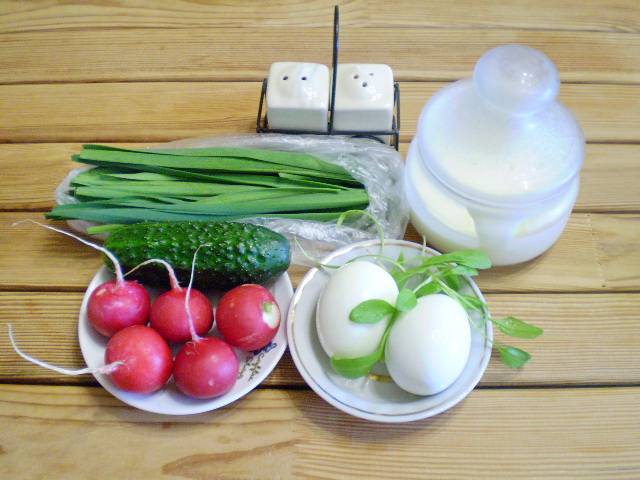 1. Приготовим овощи и зелень. Годится любая свежая зелень: петрушка, укроп, кинза, базилик, листья салата, шпинат, листья чеснока, зеленый лук перо. Все тщательно вымыть, у редиса и огурца срезать хвостики. Яйца отварить вкрутую. Очистить.