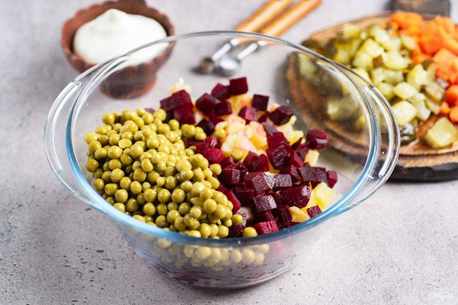 В просторную салатную миску выложите кубики картофеля, свеклы, добавьте консервированный горошек.