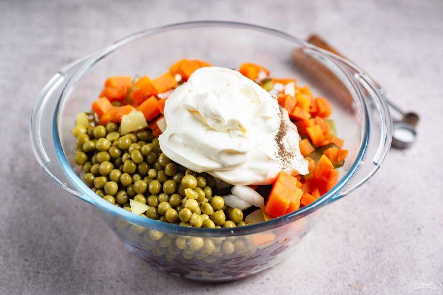 Теперь добавьте майонез, черный молотый перец и соль. Перемешайте все и попробуйте салат на соль. Если необходимо, то добавьте еще немного.