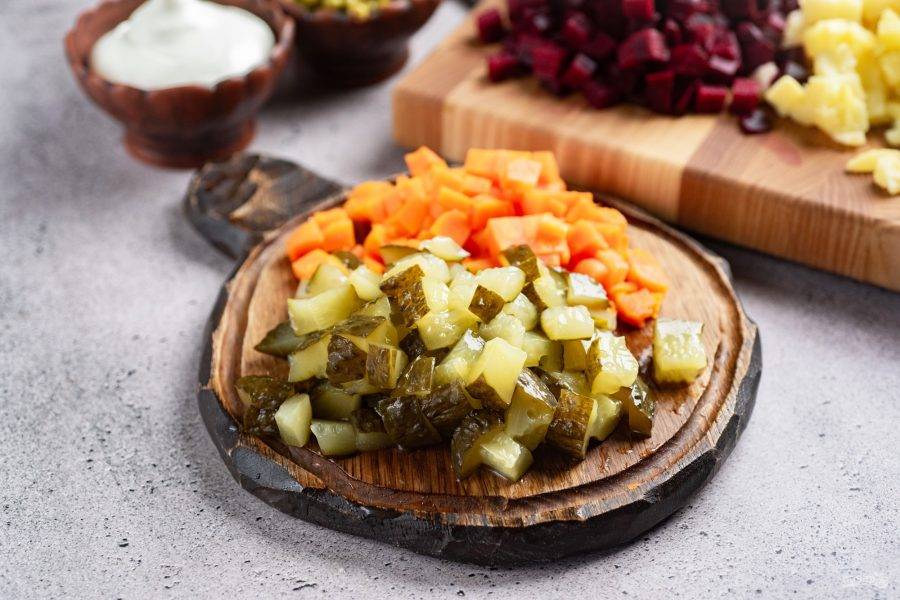 Морковь и маринованные огурчики также нарежьте небольшими кубиками.