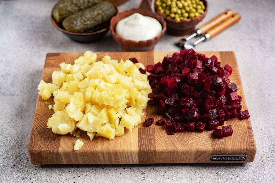 Отварные овощи охладите. Почистите картофель, свеклу и морковь.