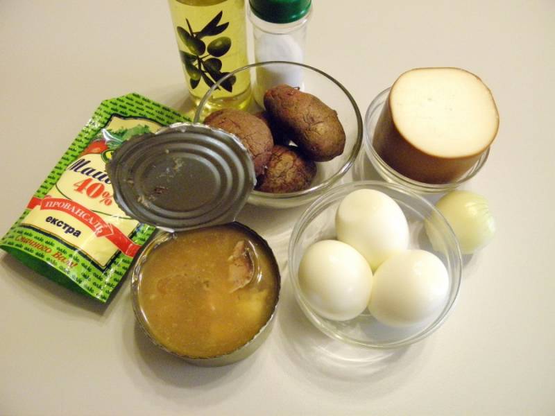 Подготовьте продукты для салата. Отварите яйца вкрутую, остудите их и очистите от скорлупы. Откройте консерву, слейте жидкость (она нам не понадобится). Очистите репчатый лук.