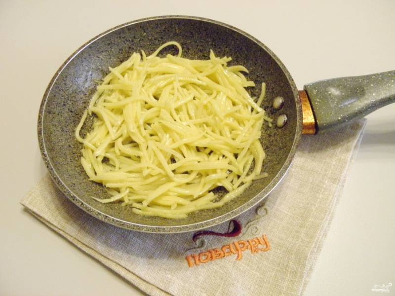 Очистите картофель. Возьмите крупную квадратную терку, натрите на ней картофель. Обжарьте на растительном масле его до готовности, посолите в процессе жарки.