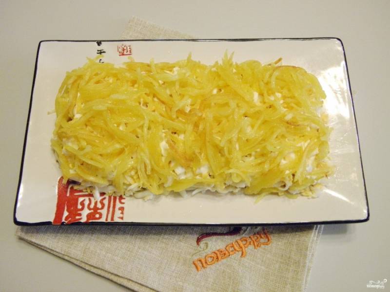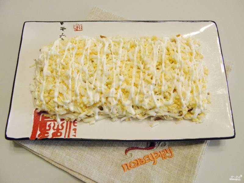 Следующий слой салата - тертые вареные яйца, майонезная сеточка, соль.