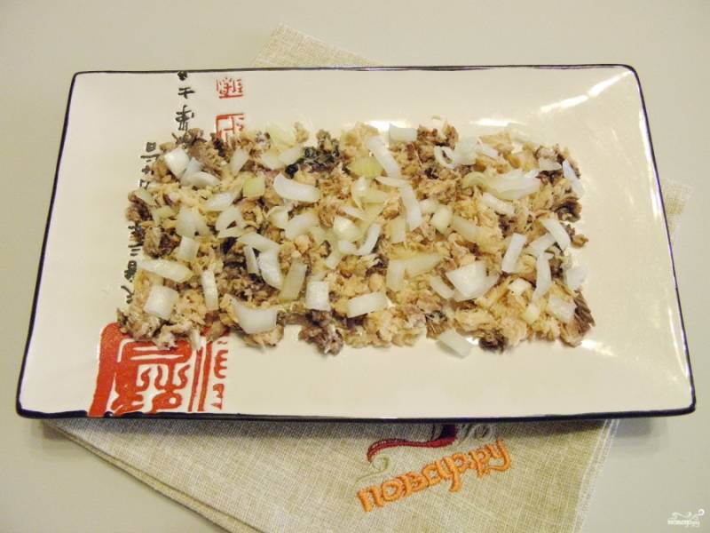 Разомните вилочкой сайру. Разложите её на тарелочке. Сверху распределите мелко порезанный репчатый лук. Если лук горький, ошпарьте его кипятком. Сделайте майонезную сеточку.