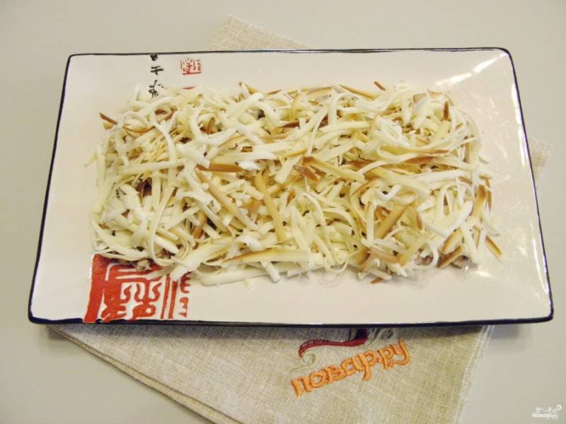 Колбасный сыр натрите на крупной терке и распределите по салату. Сделайте майонезную сеточку.