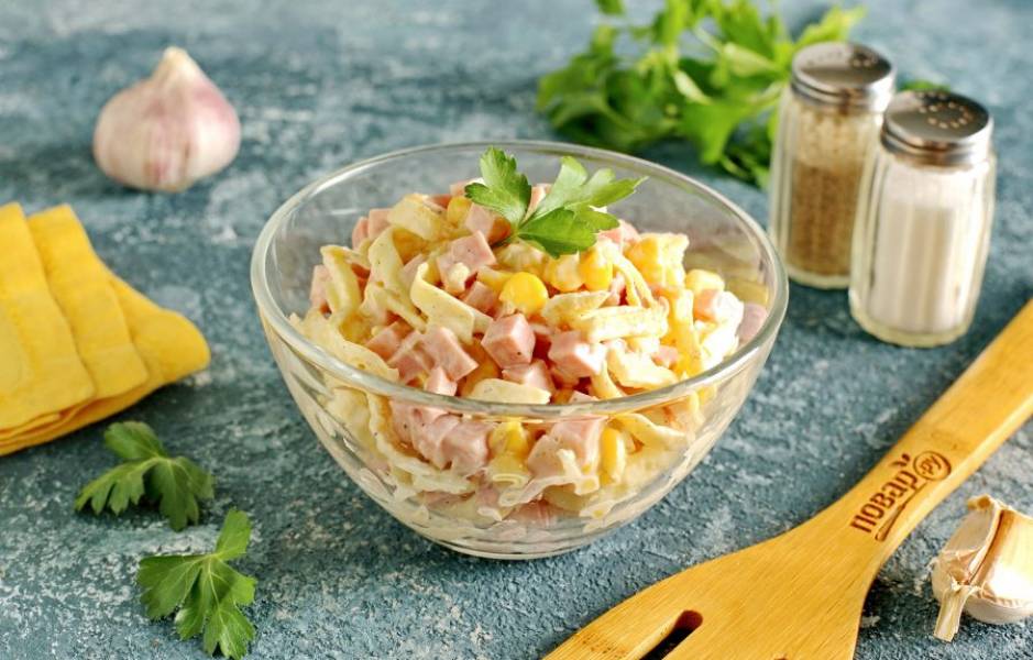 Сытный и питательный салат с колбасой и лавашом можно сделать за пару минут до прихода гостей или для быстрого перекуса. Его не готовят заранее, чтобы нарезка лаваша не размокла от рассола.