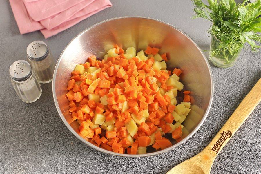 Огурец нарежьте кубиками, слегка отожмите и добавьте к остальным ингредиентам.