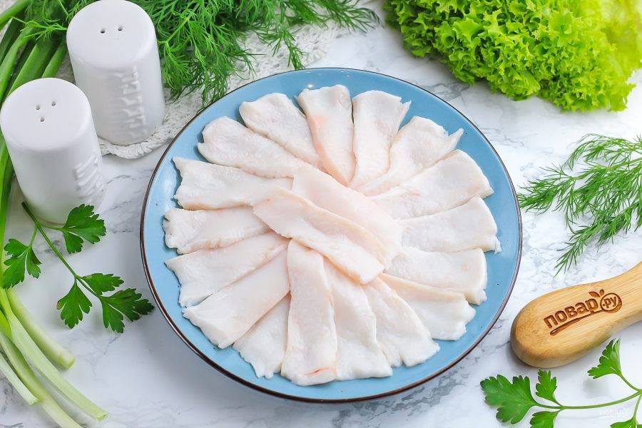 Промойте сало в воде и обсушите бумажными салфетками. Соскоблите или срежьте те участки, которые вам не нравятся. Поместите в морозилку на 15-20 минут, чтобы сало подморозилось, так его будет легче нарезать. Нарежьте тонкими слайсами и выложите на тарелку.