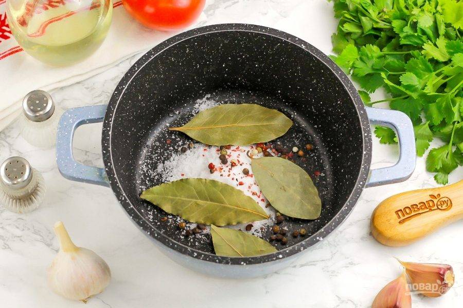 В ковш, казан или кастрюлю всыпьте соль, добавьте горошины черного перца или любые другие приправы и специи по вашему вкусу. Можно дополнить их веточкой тимьяна, молотой паприкой и т.д.