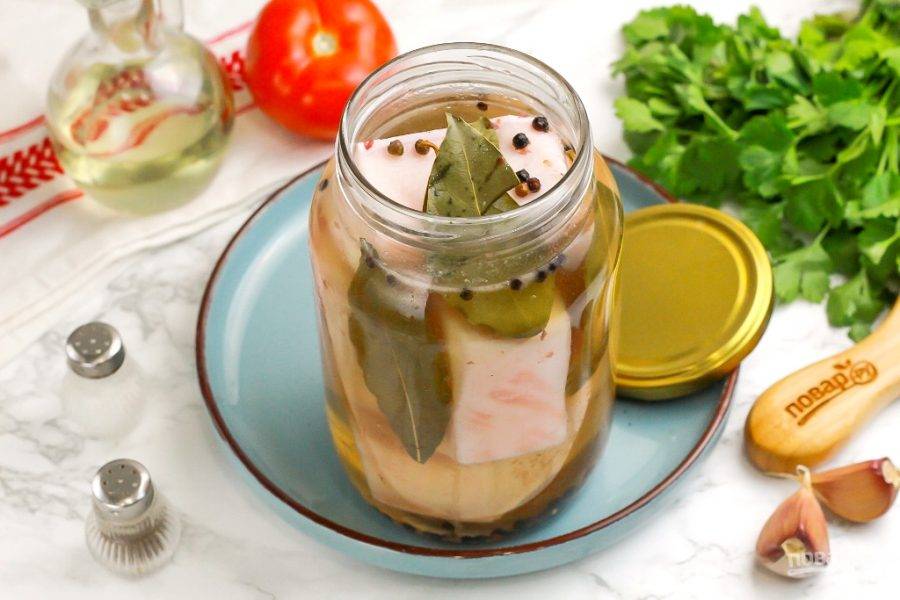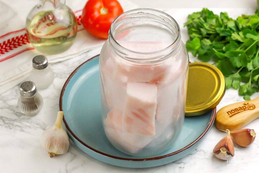 Выложите их в банку или контейнер для пищевых продуктов. Не заполняйте до верха, так как сало должно быть полностью покрыто рассолом.