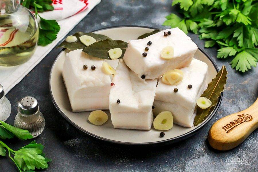 Нарежьте слайсами очищенные зубчики чеснока и выложите на сало. Влейте остывший рассол вместе с горошинами перца и лавровыми листьями, закройте крышкой банку или контейнер и отправьте в холодильник на 3-4 дня. Когда рассол станет мутноватым, а сало приобретет соленость и ароматность — извлеките его из рассола и храните в морозилке.