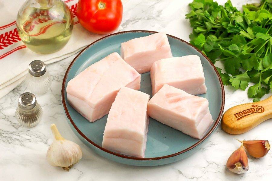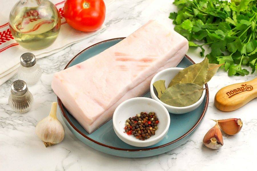 Подготовьте указанные продукты. Промойте сало в воде, соскоблите грязь с кожи ножом и оботрите все бумажными салфетками.