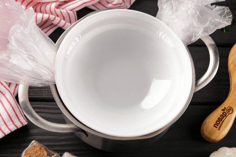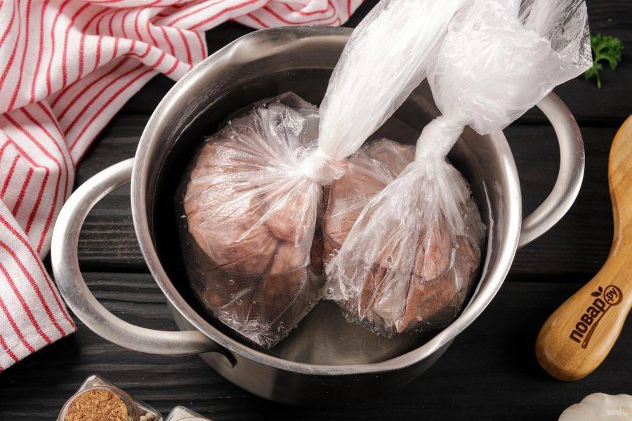 Поместите пакеты в ещё один пакет (для страховки — если будет дырочка, чтобы жир не вытек) и тоже плотно завяжите. Поместите пакеты в кастрюлю и залейте водой.